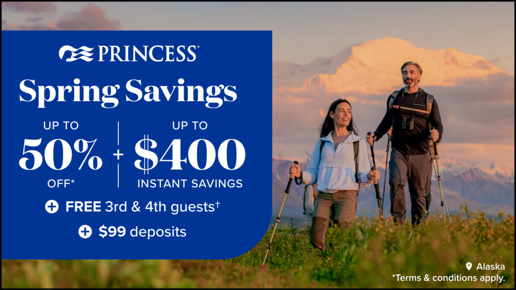 As winter woes begin to thaw, spring wows are set to awe. And the best part of the season — Spring Savings at Princess. Look ahead to incredible vacation memories in whatever part of the world is calling your name — from scenic Alaska to the quaint towns of Europe or the Caribbean’s famed beaches. Wherever you sail, the deals are in full bloom with up to 50% off fares, up to $400 instant savings and $99 deposits. Bring the family — because 3rd and 4th guests sail FREE on select voyages (taxes and fees apply). Let the Spring Savings begin!
